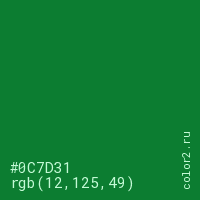 Цвет #0C7D31 в цветовой модели RGB обозначается тремя октетами (12, 125, 49) в десятичном формате и #0C7D31 в шестнадцатиричном (hex) формате, которые являются интенсивностью красного 12 (hex 0C), интенсивность зелёного 125 (hex 7D) и интенсивность синего 49 (hex 31).