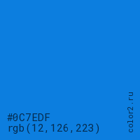 Цвет #0C7EDF в цветовой модели RGB обозначается тремя октетами (12, 126, 223) в десятичном формате и #0C7EDF в шестнадцатиричном (hex) формате, которые являются интенсивностью красного 12 (hex 0C), интенсивность зелёного 126 (hex 7E) и интенсивность синего 223 (hex DF).