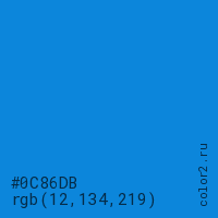 Цвет #0C86DB в цветовой модели RGB обозначается тремя октетами (12, 134, 219) в десятичном формате и #0C86DB в шестнадцатиричном (hex) формате, которые являются интенсивностью красного 12 (hex 0C), интенсивность зелёного 134 (hex 86) и интенсивность синего 219 (hex DB).