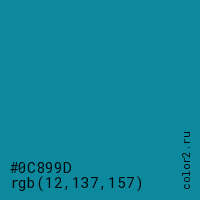 Цвет #0C899D в цветовой модели RGB обозначается тремя октетами (12, 137, 157) в десятичном формате и #0C899D в шестнадцатиричном (hex) формате, которые являются интенсивностью красного 12 (hex 0C), интенсивность зелёного 137 (hex 89) и интенсивность синего 157 (hex 9D).