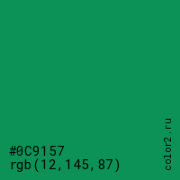 Цвет #0C9157 в цветовой модели RGB обозначается тремя октетами (12, 145, 87) в десятичном формате и #0C9157 в шестнадцатиричном (hex) формате, которые являются интенсивностью красного 12 (hex 0C), интенсивность зелёного 145 (hex 91) и интенсивность синего 87 (hex 57).