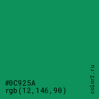 Цвет #0C925A в цветовой модели RGB обозначается тремя октетами (12, 146, 90) в десятичном формате и #0C925A в шестнадцатиричном (hex) формате, которые являются интенсивностью красного 12 (hex 0C), интенсивность зелёного 146 (hex 92) и интенсивность синего 90 (hex 5A).