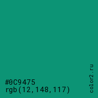 Цвет #0C9475 в цветовой модели RGB обозначается тремя октетами (12, 148, 117) в десятичном формате и #0C9475 в шестнадцатиричном (hex) формате, которые являются интенсивностью красного 12 (hex 0C), интенсивность зелёного 148 (hex 94) и интенсивность синего 117 (hex 75).