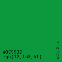 Цвет #0C993D в цветовой модели RGB обозначается тремя октетами (12, 153, 61) в десятичном формате и #0C993D в шестнадцатиричном (hex) формате, которые являются интенсивностью красного 12 (hex 0C), интенсивность зелёного 153 (hex 99) и интенсивность синего 61 (hex 3D).