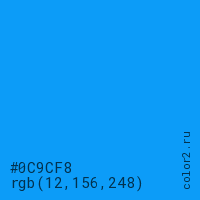Цвет #0C9CF8 в цветовой модели RGB обозначается тремя октетами (12, 156, 248) в десятичном формате и #0C9CF8 в шестнадцатиричном (hex) формате, которые являются интенсивностью красного 12 (hex 0C), интенсивность зелёного 156 (hex 9C) и интенсивность синего 248 (hex F8).