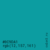 Цвет #0C9DA1 в цветовой модели RGB обозначается тремя октетами (12, 157, 161) в десятичном формате и #0C9DA1 в шестнадцатиричном (hex) формате, которые являются интенсивностью красного 12 (hex 0C), интенсивность зелёного 157 (hex 9D) и интенсивность синего 161 (hex A1).