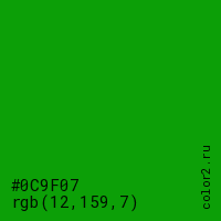 Цвет #0C9F07 в цветовой модели RGB обозначается тремя октетами (12, 159, 7) в десятичном формате и #0C9F07 в шестнадцатиричном (hex) формате, которые являются интенсивностью красного 12 (hex 0C), интенсивность зелёного 159 (hex 9F) и интенсивность синего 7 (hex 07).