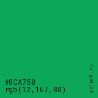 Цвет #0CA758 в цветовой модели RGB обозначается тремя октетами (12, 167, 88) в десятичном формате и #0CA758 в шестнадцатиричном (hex) формате, которые являются интенсивностью красного 12 (hex 0C), интенсивность зелёного 167 (hex A7) и интенсивность синего 88 (hex 58).