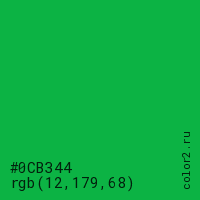 Цвет #0CB344 в цветовой модели RGB обозначается тремя октетами (12, 179, 68) в десятичном формате и #0CB344 в шестнадцатиричном (hex) формате, которые являются интенсивностью красного 12 (hex 0C), интенсивность зелёного 179 (hex B3) и интенсивность синего 68 (hex 44).