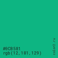 Цвет #0CB581 в цветовой модели RGB обозначается тремя октетами (12, 181, 129) в десятичном формате и #0CB581 в шестнадцатиричном (hex) формате, которые являются интенсивностью красного 12 (hex 0C), интенсивность зелёного 181 (hex B5) и интенсивность синего 129 (hex 81).