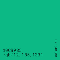 Цвет #0CB985 в цветовой модели RGB обозначается тремя октетами (12, 185, 133) в десятичном формате и #0CB985 в шестнадцатиричном (hex) формате, которые являются интенсивностью красного 12 (hex 0C), интенсивность зелёного 185 (hex B9) и интенсивность синего 133 (hex 85).