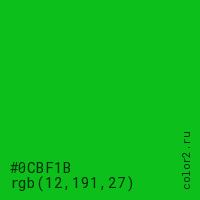Цвет #0CBF1B в цветовой модели RGB обозначается тремя октетами (12, 191, 27) в десятичном формате и #0CBF1B в шестнадцатиричном (hex) формате, которые являются интенсивностью красного 12 (hex 0C), интенсивность зелёного 191 (hex BF) и интенсивность синего 27 (hex 1B).