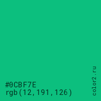 Цвет #0CBF7E в цветовой модели RGB обозначается тремя октетами (12, 191, 126) в десятичном формате и #0CBF7E в шестнадцатиричном (hex) формате, которые являются интенсивностью красного 12 (hex 0C), интенсивность зелёного 191 (hex BF) и интенсивность синего 126 (hex 7E).