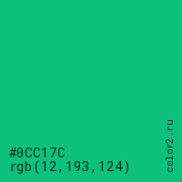 Цвет #0CC17C в цветовой модели RGB обозначается тремя октетами (12, 193, 124) в десятичном формате и #0CC17C в шестнадцатиричном (hex) формате, которые являются интенсивностью красного 12 (hex 0C), интенсивность зелёного 193 (hex C1) и интенсивность синего 124 (hex 7C).
