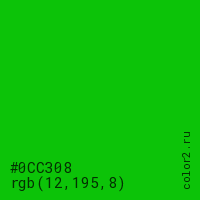 Цвет #0CC308 в цветовой модели RGB обозначается тремя октетами (12, 195, 8) в десятичном формате и #0CC308 в шестнадцатиричном (hex) формате, которые являются интенсивностью красного 12 (hex 0C), интенсивность зелёного 195 (hex C3) и интенсивность синего 8 (hex 08).