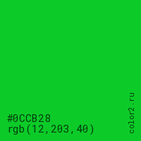 Цвет #0CCB28 в цветовой модели RGB обозначается тремя октетами (12, 203, 40) в десятичном формате и #0CCB28 в шестнадцатиричном (hex) формате, которые являются интенсивностью красного 12 (hex 0C), интенсивность зелёного 203 (hex CB) и интенсивность синего 40 (hex 28).