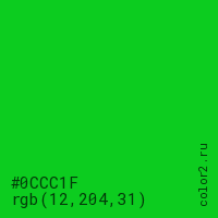 Цвет #0CCC1F в цветовой модели RGB обозначается тремя октетами (12, 204, 31) в десятичном формате и #0CCC1F в шестнадцатиричном (hex) формате, которые являются интенсивностью красного 12 (hex 0C), интенсивность зелёного 204 (hex CC) и интенсивность синего 31 (hex 1F).