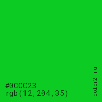 Цвет #0CCC23 в цветовой модели RGB обозначается тремя октетами (12, 204, 35) в десятичном формате и #0CCC23 в шестнадцатиричном (hex) формате, которые являются интенсивностью красного 12 (hex 0C), интенсивность зелёного 204 (hex CC) и интенсивность синего 35 (hex 23).