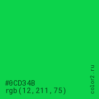 Цвет #0CD34B в цветовой модели RGB обозначается тремя октетами (12, 211, 75) в десятичном формате и #0CD34B в шестнадцатиричном (hex) формате, которые являются интенсивностью красного 12 (hex 0C), интенсивность зелёного 211 (hex D3) и интенсивность синего 75 (hex 4B).