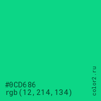 Цвет #0CD686 в цветовой модели RGB обозначается тремя октетами (12, 214, 134) в десятичном формате и #0CD686 в шестнадцатиричном (hex) формате, которые являются интенсивностью красного 12 (hex 0C), интенсивность зелёного 214 (hex D6) и интенсивность синего 134 (hex 86).