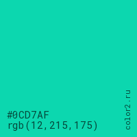 Цвет #0CD7AF в цветовой модели RGB обозначается тремя октетами (12, 215, 175) в десятичном формате и #0CD7AF в шестнадцатиричном (hex) формате, которые являются интенсивностью красного 12 (hex 0C), интенсивность зелёного 215 (hex D7) и интенсивность синего 175 (hex AF).
