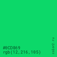 Цвет #0CD869 в цветовой модели RGB обозначается тремя октетами (12, 216, 105) в десятичном формате и #0CD869 в шестнадцатиричном (hex) формате, которые являются интенсивностью красного 12 (hex 0C), интенсивность зелёного 216 (hex D8) и интенсивность синего 105 (hex 69).