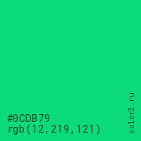 Цвет #0CDB79 в цветовой модели RGB обозначается тремя октетами (12, 219, 121) в десятичном формате и #0CDB79 в шестнадцатиричном (hex) формате, которые являются интенсивностью красного 12 (hex 0C), интенсивность зелёного 219 (hex DB) и интенсивность синего 121 (hex 79).