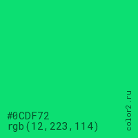 Цвет #0CDF72 в цветовой модели RGB обозначается тремя октетами (12, 223, 114) в десятичном формате и #0CDF72 в шестнадцатиричном (hex) формате, которые являются интенсивностью красного 12 (hex 0C), интенсивность зелёного 223 (hex DF) и интенсивность синего 114 (hex 72).