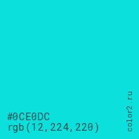 Цвет #0CE0DC в цветовой модели RGB обозначается тремя октетами (12, 224, 220) в десятичном формате и #0CE0DC в шестнадцатиричном (hex) формате, которые являются интенсивностью красного 12 (hex 0C), интенсивность зелёного 224 (hex E0) и интенсивность синего 220 (hex DC).