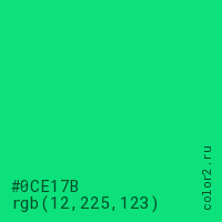 Цвет #0CE17B в цветовой модели RGB обозначается тремя октетами (12, 225, 123) в десятичном формате и #0CE17B в шестнадцатиричном (hex) формате, которые являются интенсивностью красного 12 (hex 0C), интенсивность зелёного 225 (hex E1) и интенсивность синего 123 (hex 7B).