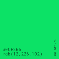 Цвет #0CE266 в цветовой модели RGB обозначается тремя октетами (12, 226, 102) в десятичном формате и #0CE266 в шестнадцатиричном (hex) формате, которые являются интенсивностью красного 12 (hex 0C), интенсивность зелёного 226 (hex E2) и интенсивность синего 102 (hex 66).