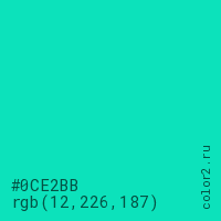 Цвет #0CE2BB в цветовой модели RGB обозначается тремя октетами (12, 226, 187) в десятичном формате и #0CE2BB в шестнадцатиричном (hex) формате, которые являются интенсивностью красного 12 (hex 0C), интенсивность зелёного 226 (hex E2) и интенсивность синего 187 (hex BB).