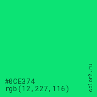 Цвет #0CE374 в цветовой модели RGB обозначается тремя октетами (12, 227, 116) в десятичном формате и #0CE374 в шестнадцатиричном (hex) формате, которые являются интенсивностью красного 12 (hex 0C), интенсивность зелёного 227 (hex E3) и интенсивность синего 116 (hex 74).