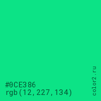 Цвет #0CE386 в цветовой модели RGB обозначается тремя октетами (12, 227, 134) в десятичном формате и #0CE386 в шестнадцатиричном (hex) формате, которые являются интенсивностью красного 12 (hex 0C), интенсивность зелёного 227 (hex E3) и интенсивность синего 134 (hex 86).