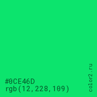 Цвет #0CE46D в цветовой модели RGB обозначается тремя октетами (12, 228, 109) в десятичном формате и #0CE46D в шестнадцатиричном (hex) формате, которые являются интенсивностью красного 12 (hex 0C), интенсивность зелёного 228 (hex E4) и интенсивность синего 109 (hex 6D).