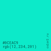 Цвет #0CEAC9 в цветовой модели RGB обозначается тремя октетами (12, 234, 201) в десятичном формате и #0CEAC9 в шестнадцатиричном (hex) формате, которые являются интенсивностью красного 12 (hex 0C), интенсивность зелёного 234 (hex EA) и интенсивность синего 201 (hex C9).