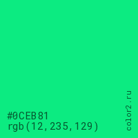 Цвет #0CEB81 в цветовой модели RGB обозначается тремя октетами (12, 235, 129) в десятичном формате и #0CEB81 в шестнадцатиричном (hex) формате, которые являются интенсивностью красного 12 (hex 0C), интенсивность зелёного 235 (hex EB) и интенсивность синего 129 (hex 81).