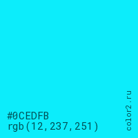 Цвет #0CEDFB в цветовой модели RGB обозначается тремя октетами (12, 237, 251) в десятичном формате и #0CEDFB в шестнадцатиричном (hex) формате, которые являются интенсивностью красного 12 (hex 0C), интенсивность зелёного 237 (hex ED) и интенсивность синего 251 (hex FB).