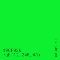 Цвет #0CF030 в цветовой модели RGB обозначается тремя октетами (12, 240, 48) в десятичном формате и #0CF030 в шестнадцатиричном (hex) формате, которые являются интенсивностью красного 12 (hex 0C), интенсивность зелёного 240 (hex F0) и интенсивность синего 48 (hex 30).