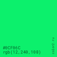 Цвет #0CF06C в цветовой модели RGB обозначается тремя октетами (12, 240, 108) в десятичном формате и #0CF06C в шестнадцатиричном (hex) формате, которые являются интенсивностью красного 12 (hex 0C), интенсивность зелёного 240 (hex F0) и интенсивность синего 108 (hex 6C).