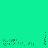 Цвет #0CF097 в цветовой модели RGB обозначается тремя октетами (12, 240, 151) в десятичном формате и #0CF097 в шестнадцатиричном (hex) формате, которые являются интенсивностью красного 12 (hex 0C), интенсивность зелёного 240 (hex F0) и интенсивность синего 151 (hex 97).