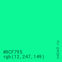 Цвет #0CF795 в цветовой модели RGB обозначается тремя октетами (12, 247, 149) в десятичном формате и #0CF795 в шестнадцатиричном (hex) формате, которые являются интенсивностью красного 12 (hex 0C), интенсивность зелёного 247 (hex F7) и интенсивность синего 149 (hex 95).