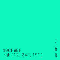 Цвет #0CF8BF в цветовой модели RGB обозначается тремя октетами (12, 248, 191) в десятичном формате и #0CF8BF в шестнадцатиричном (hex) формате, которые являются интенсивностью красного 12 (hex 0C), интенсивность зелёного 248 (hex F8) и интенсивность синего 191 (hex BF).