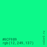 Цвет #0CF989 в цветовой модели RGB обозначается тремя октетами (12, 249, 137) в десятичном формате и #0CF989 в шестнадцатиричном (hex) формате, которые являются интенсивностью красного 12 (hex 0C), интенсивность зелёного 249 (hex F9) и интенсивность синего 137 (hex 89).