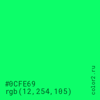 Цвет #0CFE69 в цветовой модели RGB обозначается тремя октетами (12, 254, 105) в десятичном формате и #0CFE69 в шестнадцатиричном (hex) формате, которые являются интенсивностью красного 12 (hex 0C), интенсивность зелёного 254 (hex FE) и интенсивность синего 105 (hex 69).