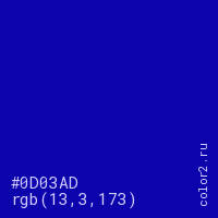 Цвет #0D03AD в цветовой модели RGB обозначается тремя октетами (13, 3, 173) в десятичном формате и #0D03AD в шестнадцатиричном (hex) формате, которые являются интенсивностью красного 13 (hex 0D), интенсивность зелёного 3 (hex 03) и интенсивность синего 173 (hex AD).