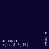 Цвет #0D0631 в цветовой модели RGB обозначается тремя октетами (13, 6, 49) в десятичном формате и #0D0631 в шестнадцатиричном (hex) формате, которые являются интенсивностью красного 13 (hex 0D), интенсивность зелёного 6 (hex 06) и интенсивность синего 49 (hex 31).