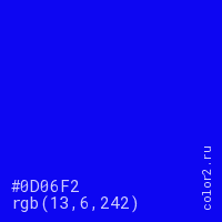 Цвет #0D06F2 в цветовой модели RGB обозначается тремя октетами (13, 6, 242) в десятичном формате и #0D06F2 в шестнадцатиричном (hex) формате, которые являются интенсивностью красного 13 (hex 0D), интенсивность зелёного 6 (hex 06) и интенсивность синего 242 (hex F2).