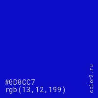 Цвет #0D0CC7 в цветовой модели RGB обозначается тремя октетами (13, 12, 199) в десятичном формате и #0D0CC7 в шестнадцатиричном (hex) формате, которые являются интенсивностью красного 13 (hex 0D), интенсивность зелёного 12 (hex 0C) и интенсивность синего 199 (hex C7).