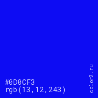 Цвет #0D0CF3 в цветовой модели RGB обозначается тремя октетами (13, 12, 243) в десятичном формате и #0D0CF3 в шестнадцатиричном (hex) формате, которые являются интенсивностью красного 13 (hex 0D), интенсивность зелёного 12 (hex 0C) и интенсивность синего 243 (hex F3).
